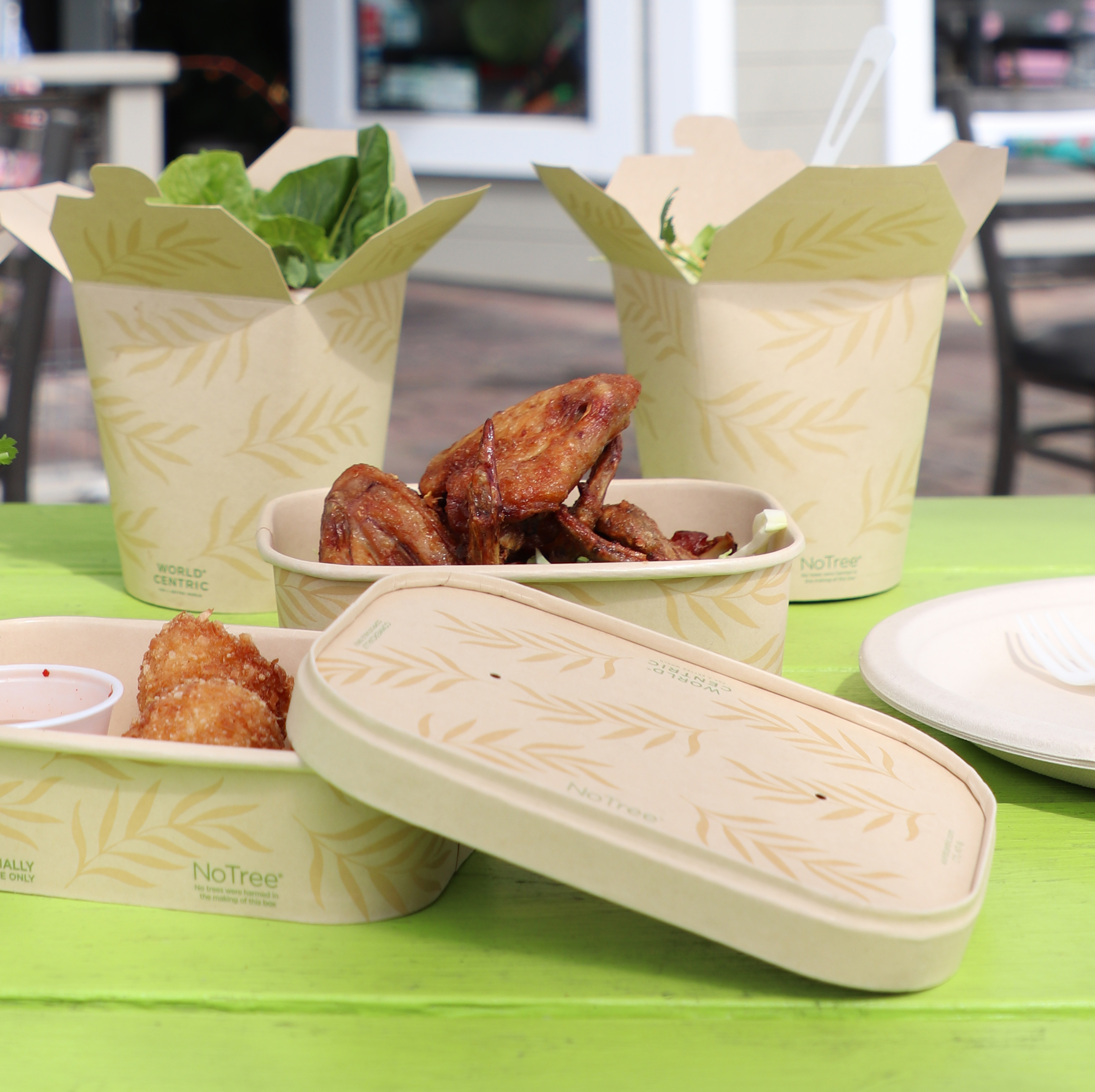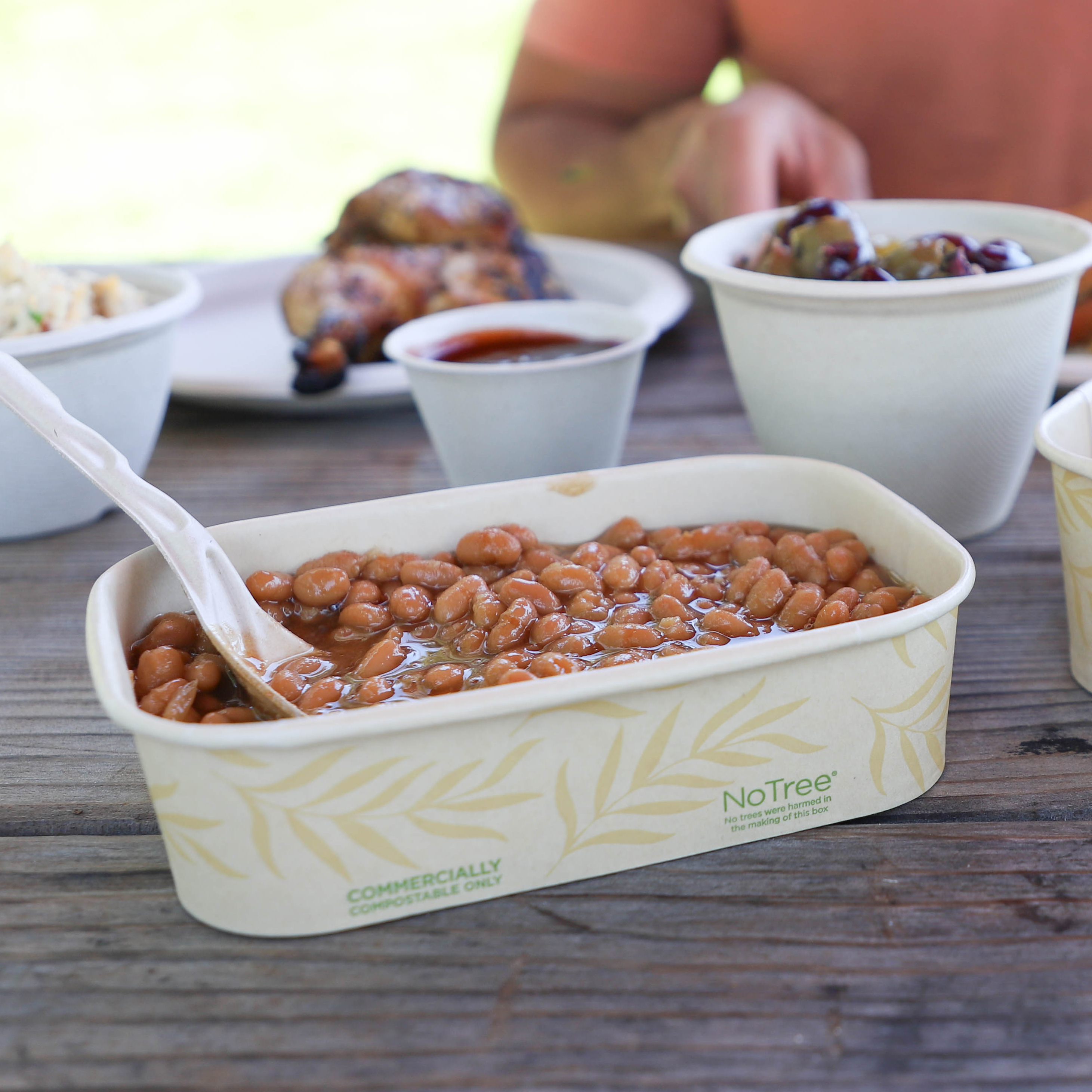 World Centric® NoTree® rectangular containers are made from paper produced from crop residues and alternative fibers like bamboo, an annually renewable resource, with a bio-lining made from plants. These bowls work great for hot or cold items for take-out and are perfect for ice cream shops and restaurants.   This item is certified compostable.  A compatible fiber lid is available separately.