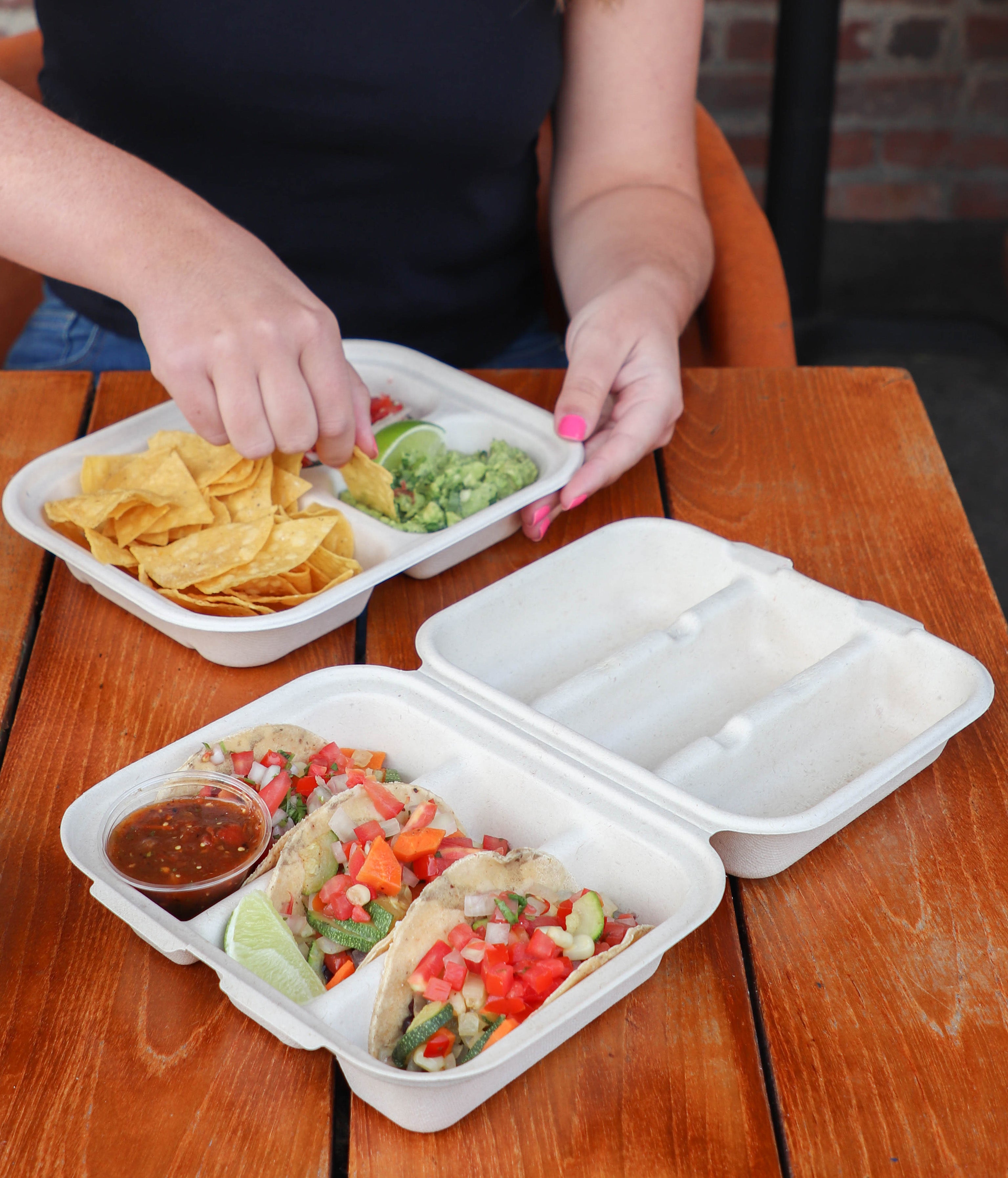 World Centric® 3-Compartment Taco Box keeps your tacos organized and fresh from kitchen to customer. Crafted from sustainable bamboo and unbleached plant fiber with zero PFAS, this 8"x7"x3" container delivers durability without compromise. The three dedicated sections prevent ingredient mixing while maintaining structural integrity—whether serving hard or soft tacos. Freezer-safe and completely free of wax or plastic linings, it's the eco-conscious choice that doesn't sacrifice functionality. Perfect for food service operations committed to compostable solutions that actually perform.