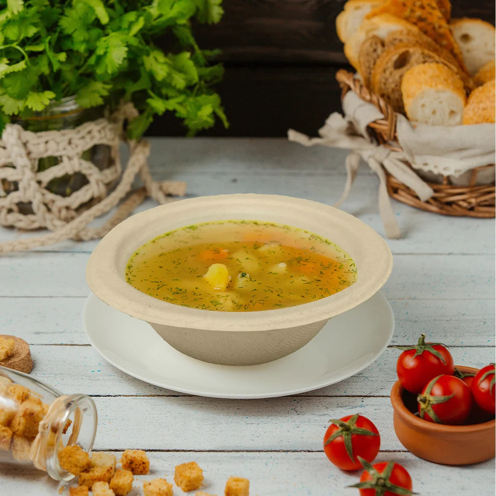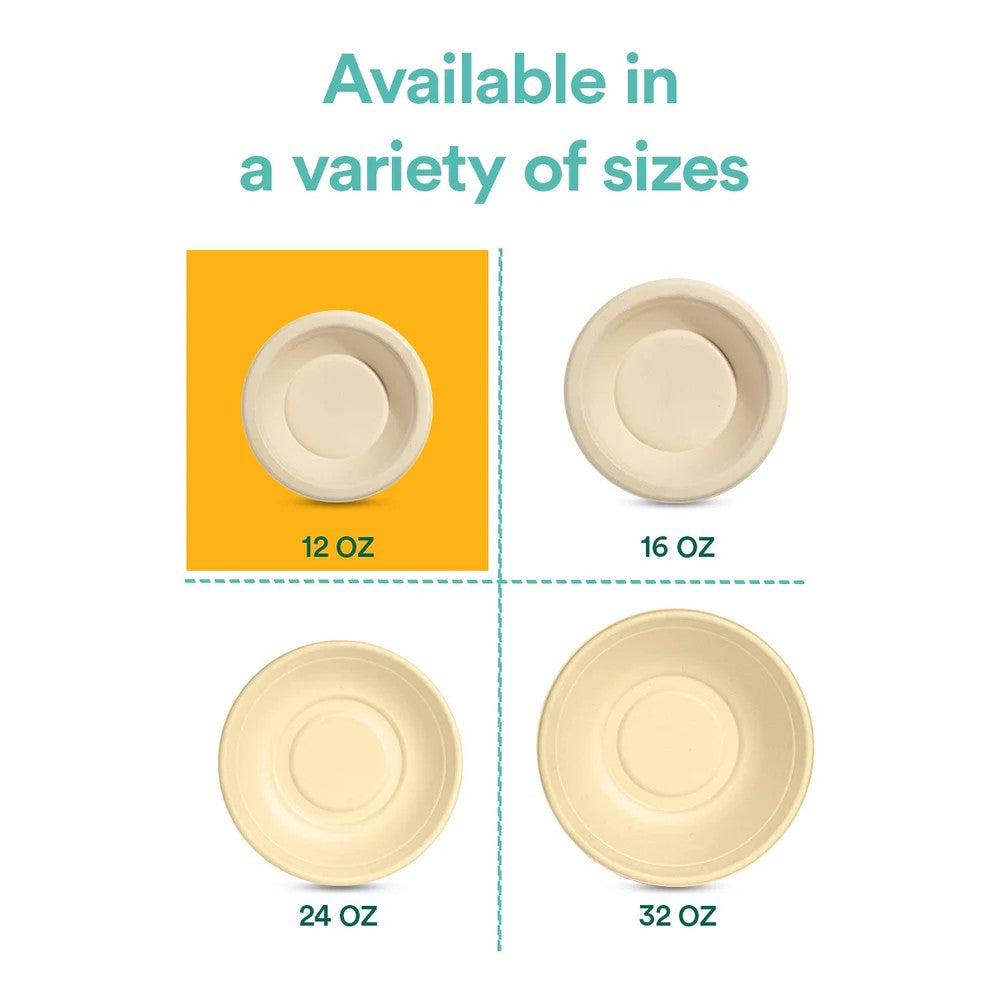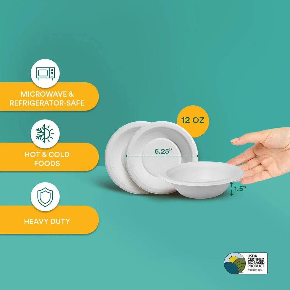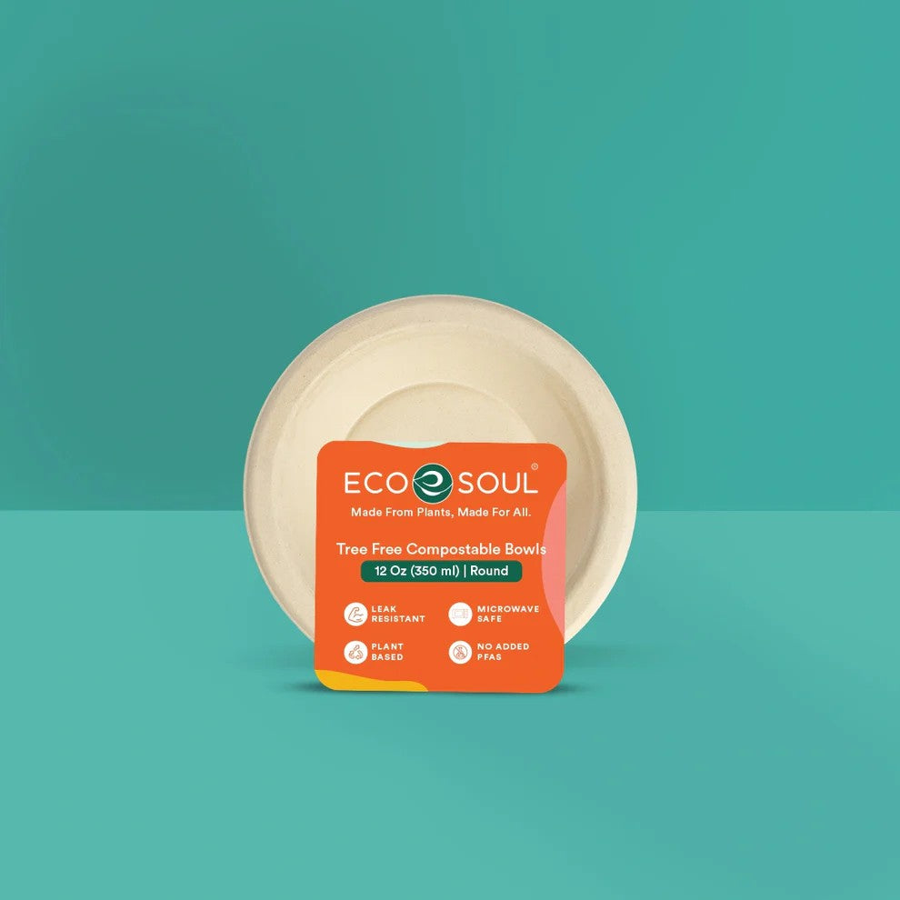 EcoSoul® 12 oz round bowls made from 100% sustainable sugarcane fiber. Durable and leak-proof, a great way to replace everyday paper plates. These bowls are microwave-safe and will hold soups, salads, desserts and are the perfect option for festivals.